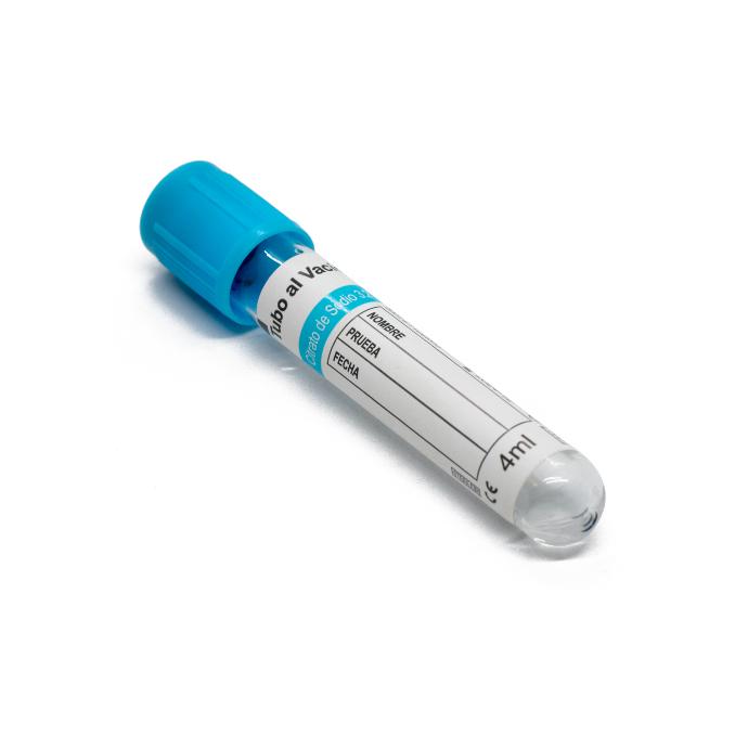 Tubo fabricado en PET para toma y recolección de muestra sanguínea con tapón color azul. Incluye citrato de sodio 3.2% para realización de pruebas de tiempos de coagulación y posee una capacidad de volumen de drenado de 4 ml.